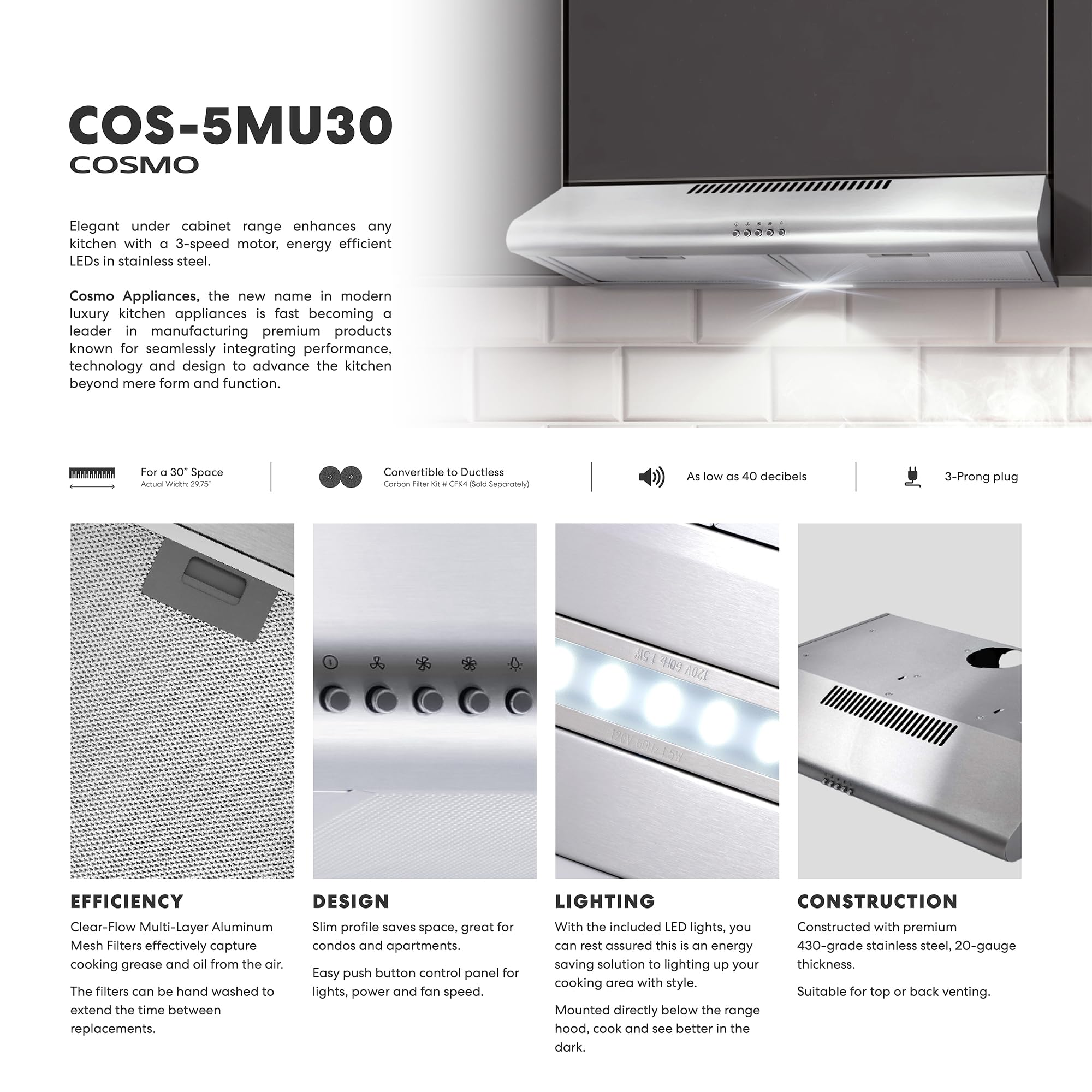 COSMO COS-5MU30 30 in. Delta Collection Ducted Under Cabinet Range Hood, Button Controls, Reusable Filters, LED Lights, Stainless Steel