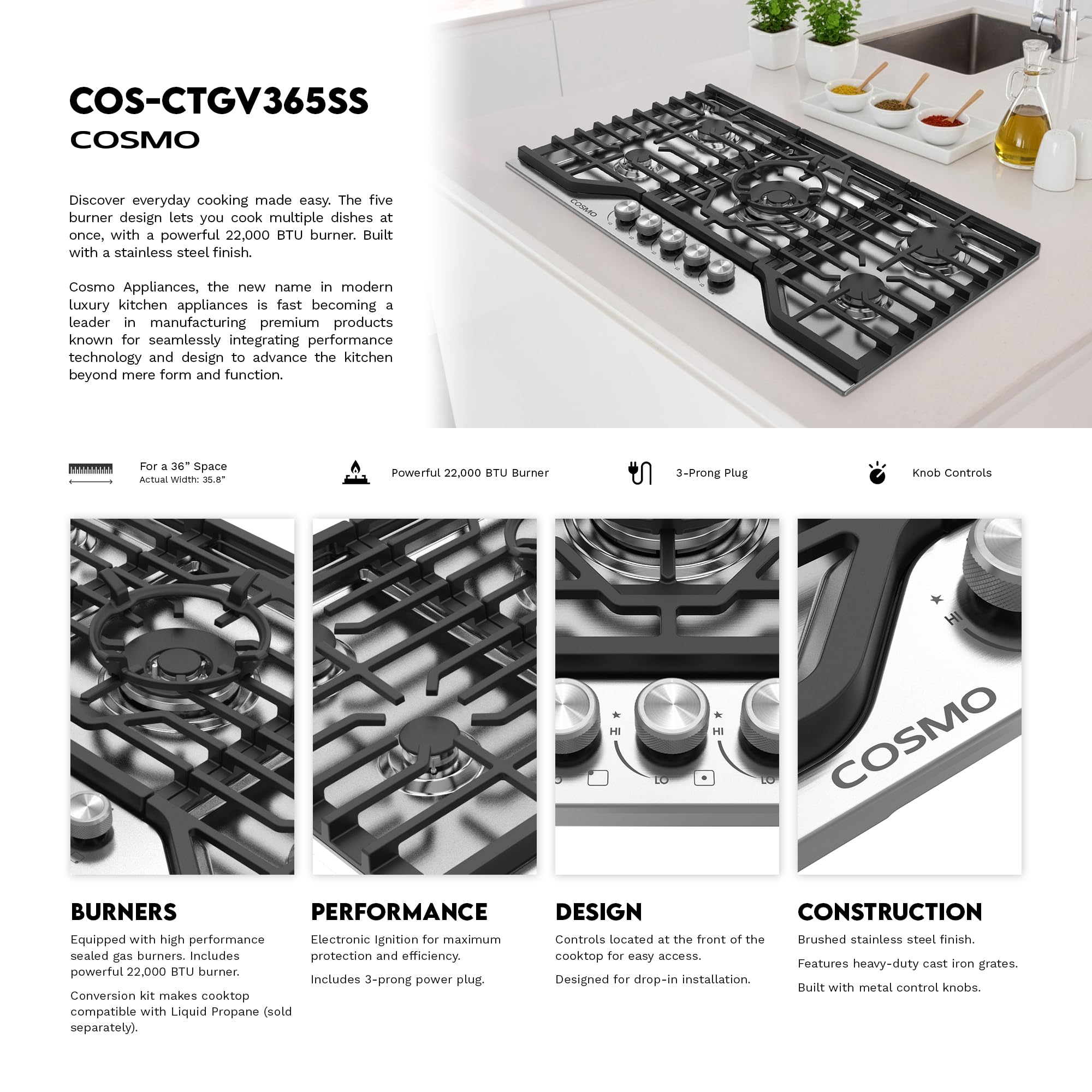 COSMO COS-CTGV365SS 36 in. Vista Collection Drop-in Gas Cooktop with 5 Burners, Metal Knobs, Cast Iron Grates in Stainless Steel—
